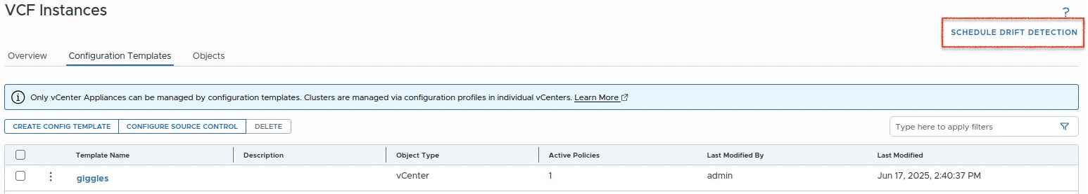 Notice there is now a secondary navigation pane to help scope your view of the function according to VCF logical constructs like at VCF Instance level and each workload domain level. At the top, the default view shows you the Config Drift service from a multi-VCF instance level. Sometimes, I refer this to view as the Global Config management view because the view here shows you objects and constructs that span all VCF Instances. This includes a summary view and the Configuration Templates. That’s right, Configuration Templates in VCF are templates that can be applied to all VCF instances, provided all instances are running 9.0 and licensed with VCF. You DO NOT have a Configuration Template per vCenter or per VCF Instance. You can literally have ONE TEMPLATE to rule them all. Ha Ha Channeling my inner LOTR here.